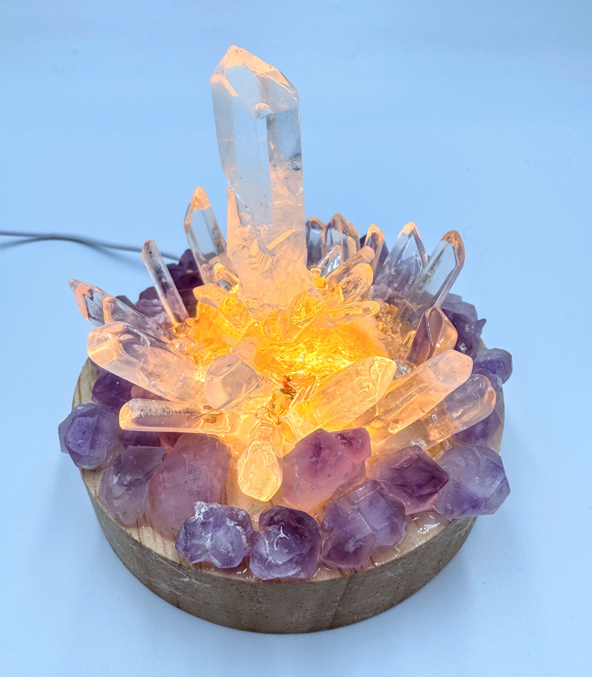 This handcrafted lamp features a tall clear quartz tower surrounded by a ring of smaller individually placed quartz points. Each one is carefully arranged by hand and set into a smooth wooden base with deep purple amethyst chunks framing the edge. Lit from below with a warm-toned LED, this piece casts a gentle amber glow that soothes the space and uplifts the spirit.