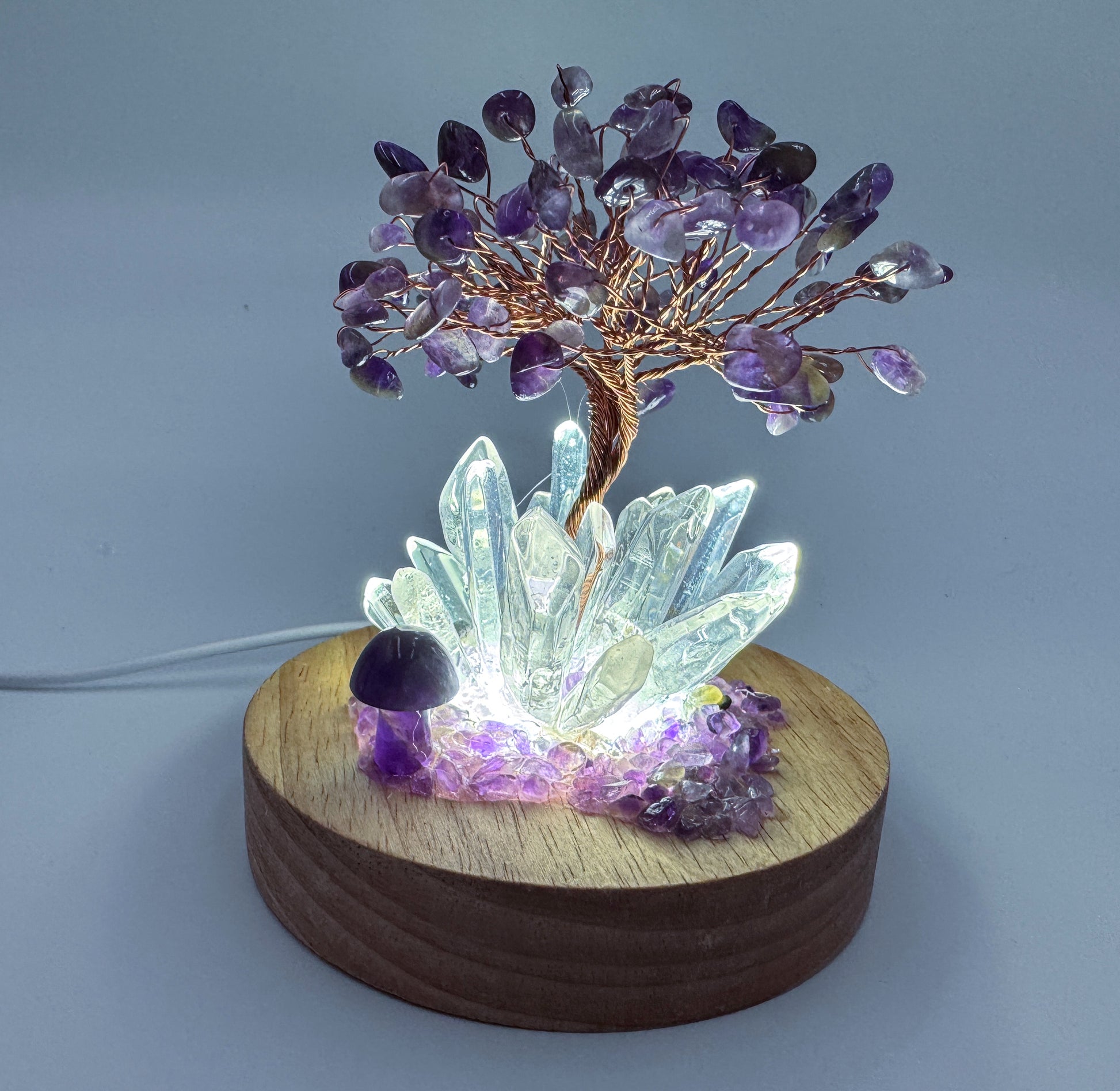This 10cm handmade lamp features a detailed amethyst gemstone tree rising above a radiant cluster of clear quartz points. At the base, a small carved amethyst mushroom rests among amethyst chips, creating a peaceful, earthy landscape. The cool white LED light beneath casts a clean, soothing glow that highlights each stone’s natural beauty.