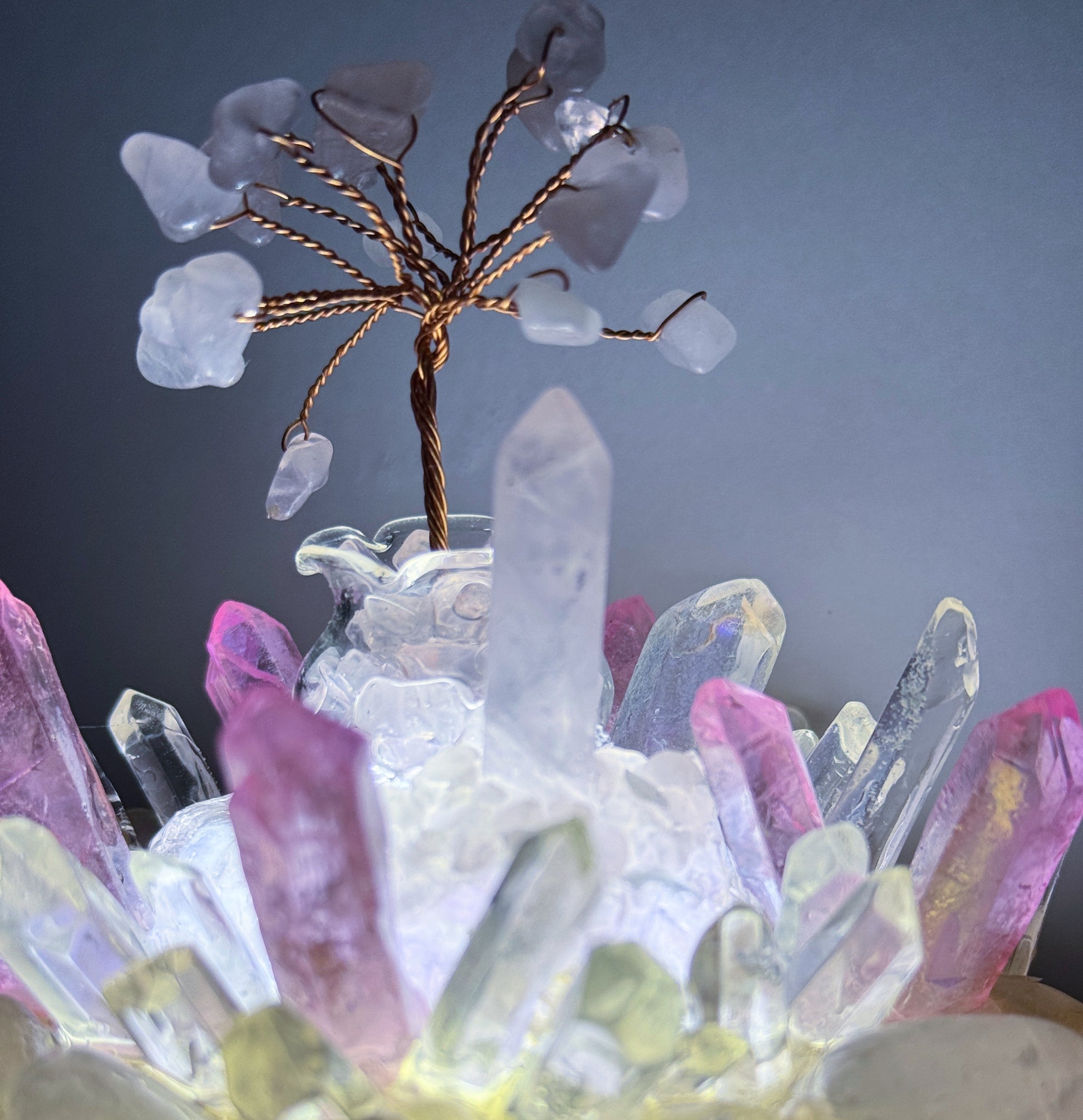 Crystals: Rose Quartz, Pink Aura Quartz, Clear Quartz, Rose Quartz Gem Tree