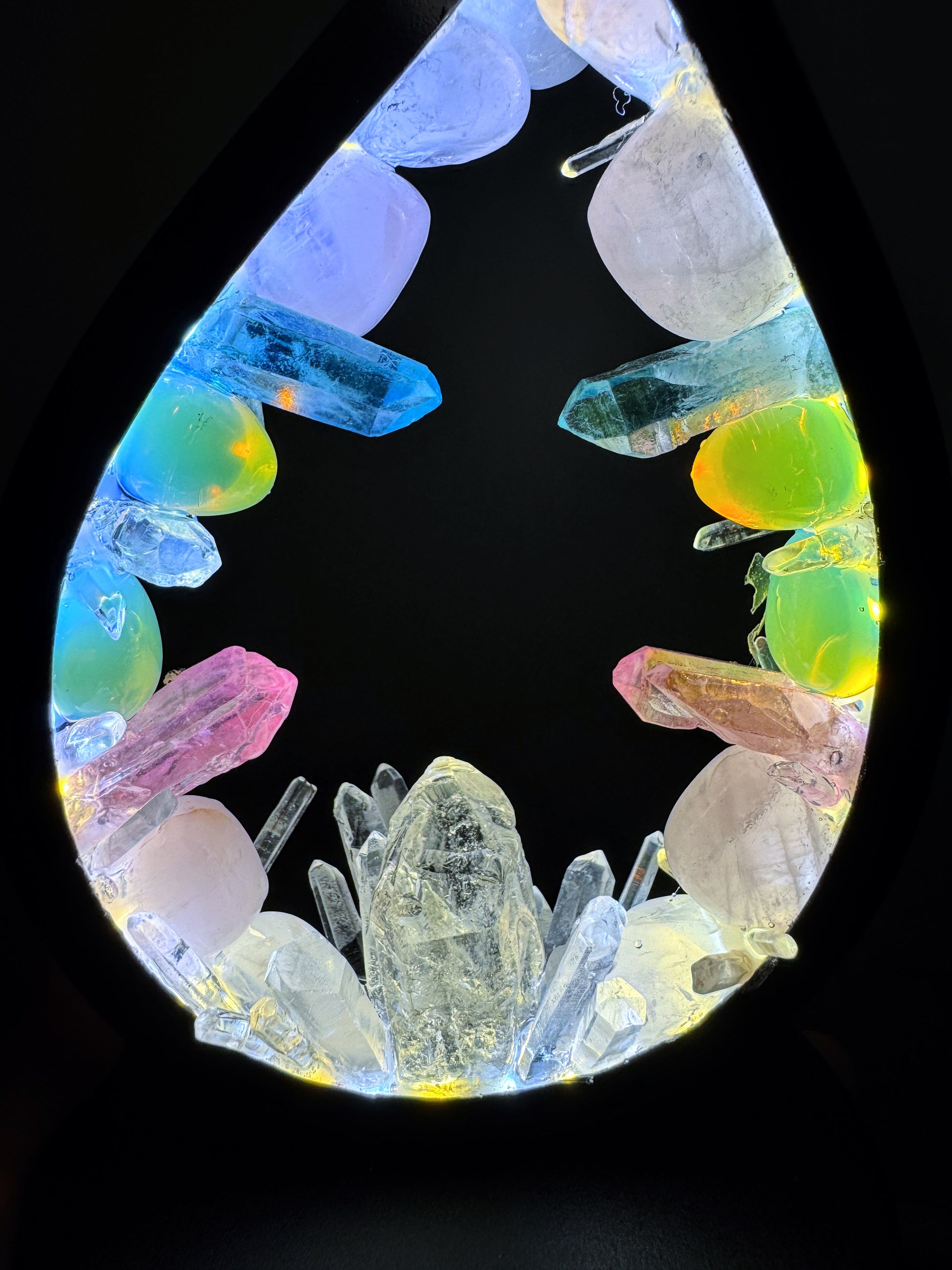 This 32 cm flame-shaped lamp features rose quartz, opalite, clear quartz, and pink and blue coloured quartz flowing through the curved frame. Soft blush tones, milky whites, and iridescent blues intertwine as the crystals catch the light, creating a calm, nurturing glow with a subtle magical feel when illuminated.