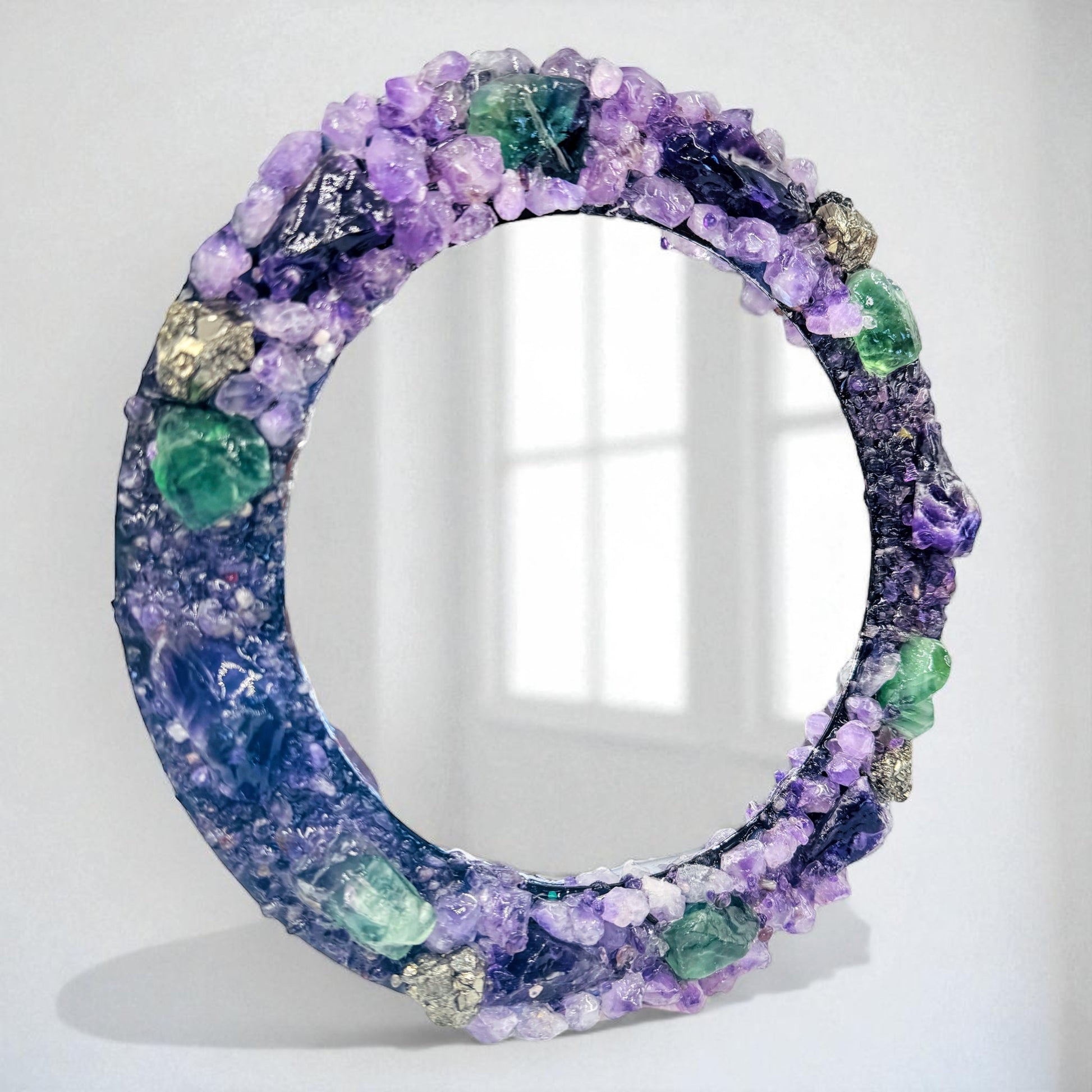 This striking handmade mirror is crafted with Amethyst, Fluorite, and Pyrite, creating a bold yet balanced piece of crystal art. Each stone is set securely in resin, highlighting their natural colours and textures while ensuring long-lasting durability.