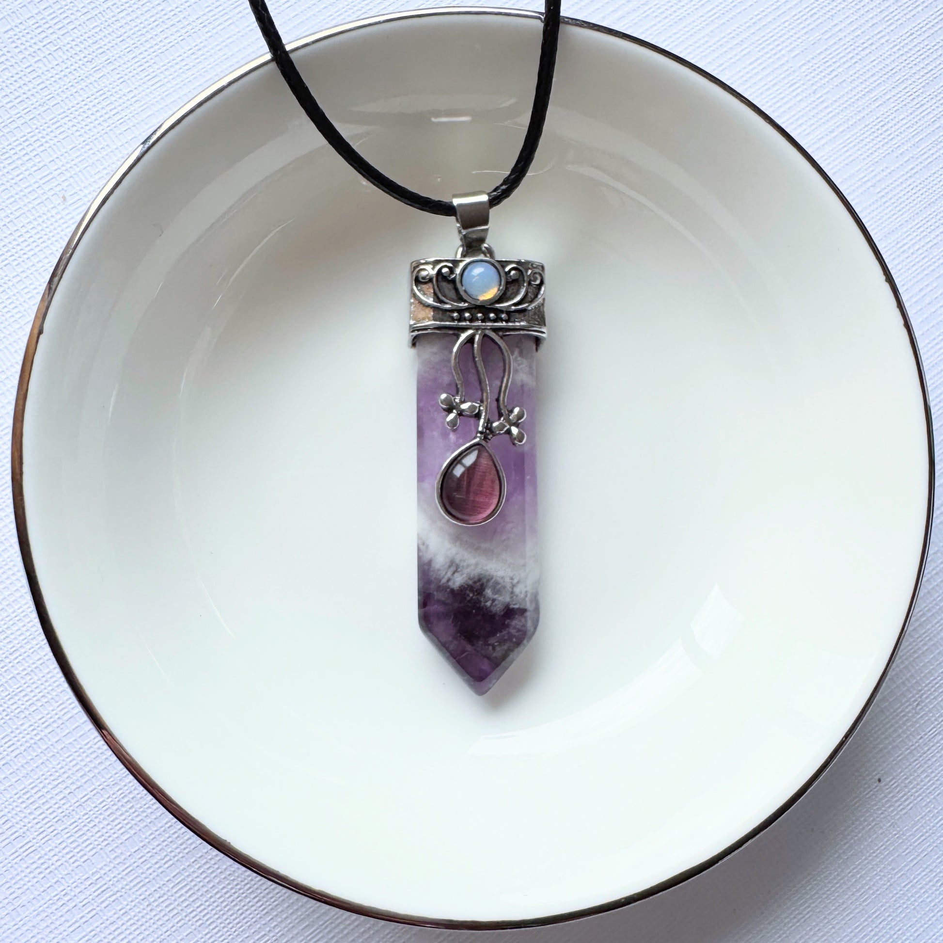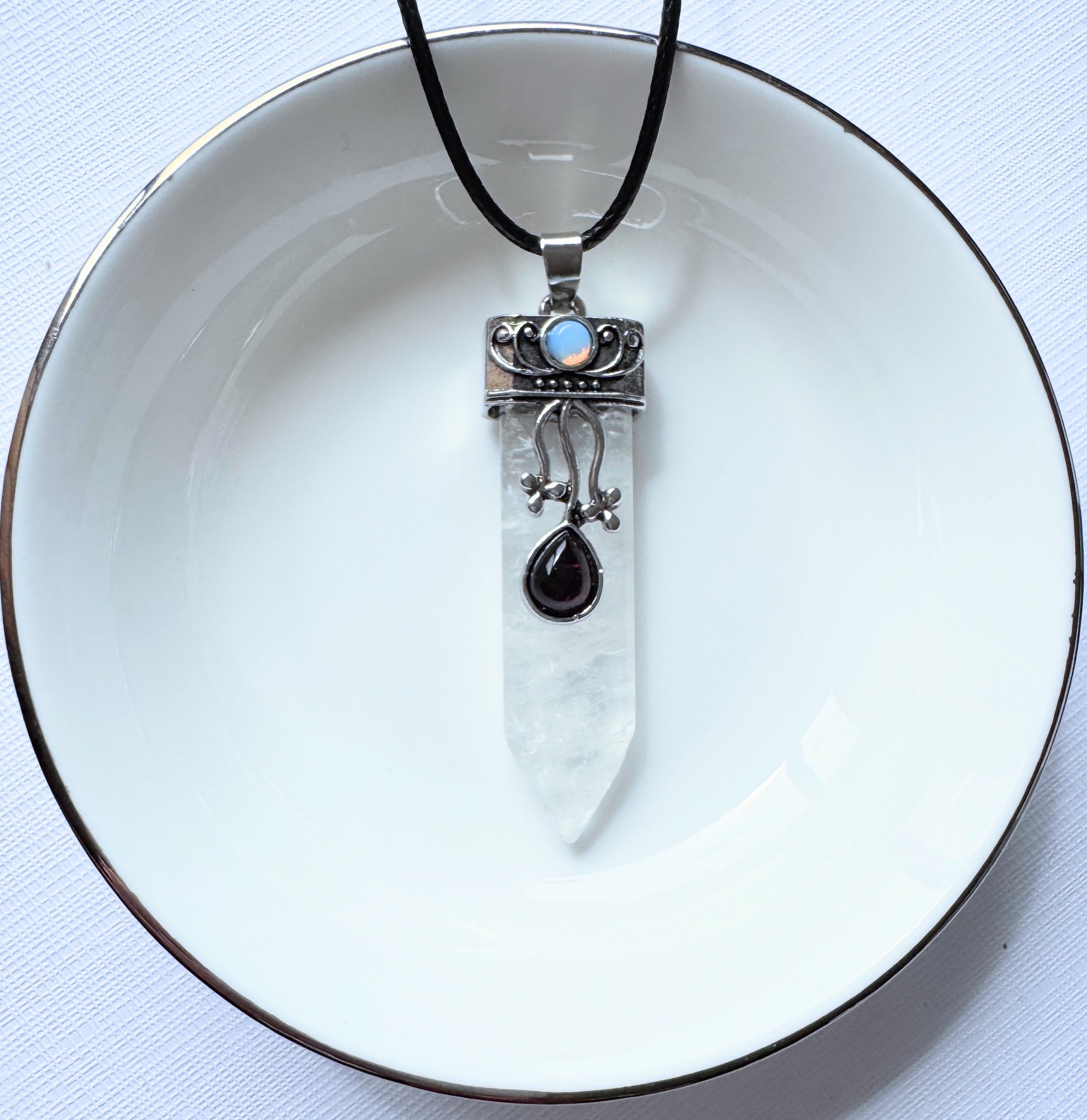 Introducing our stunning Crystal Point Pendants, featuring a flat point design with a small Opalite stone at the top. Each pendant comes with a cord, making it ready to wear and enjoy.