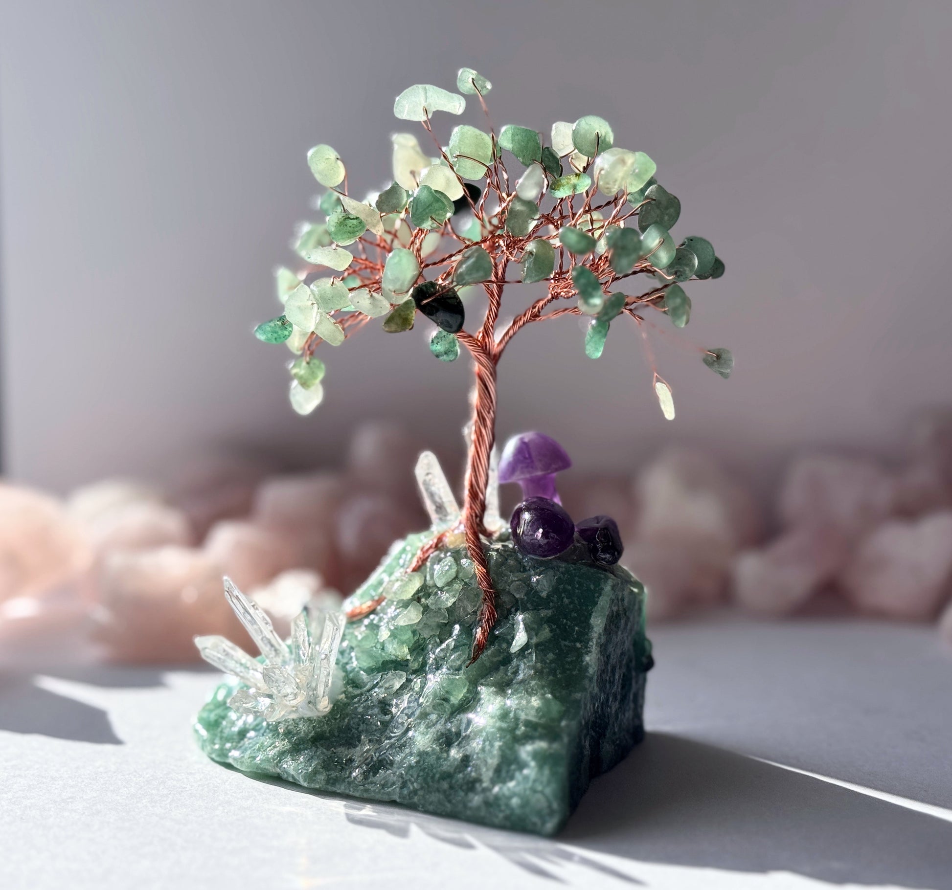 Amethyst grove crystal tree is hand crafted from green aventurine and amethyst. Each tree is hand made and one of a kind telling its own unique story.