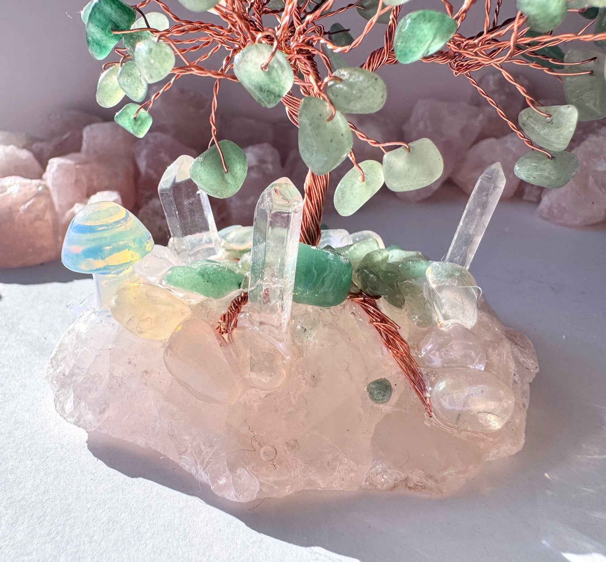Peaceful place crystal tree is hand crafted from green aventurine and Rose Quartz. Each tree is hand made and one of a kind telling its own unique story.