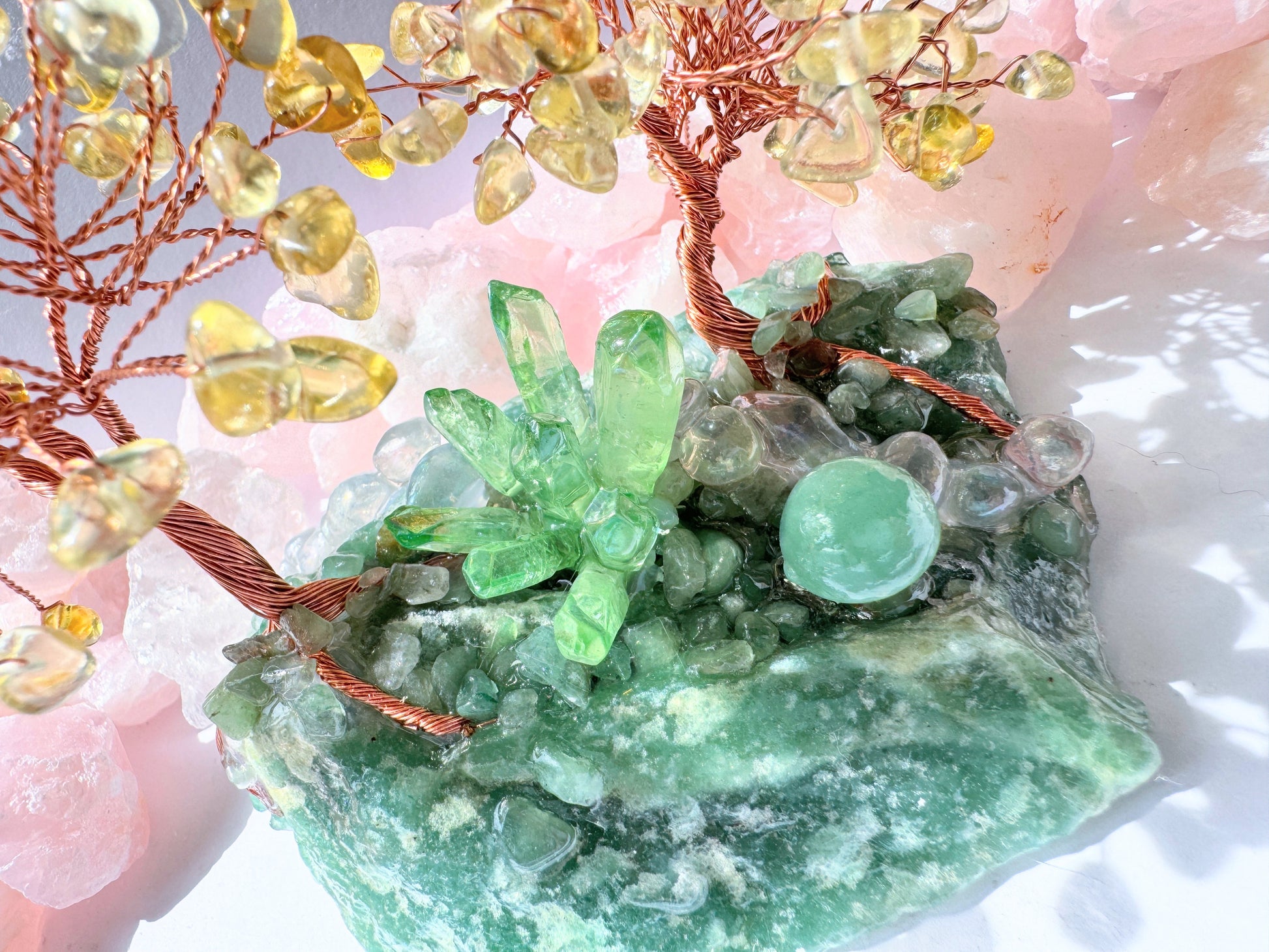 Fairy forest crystal tree is hand crafted from green aventurine and citrine with green aura quartz. . Each tree is hand made and one of a kind telling its own unique story.