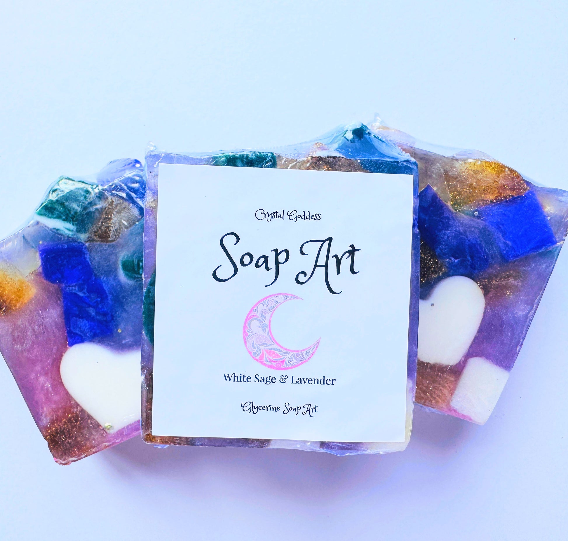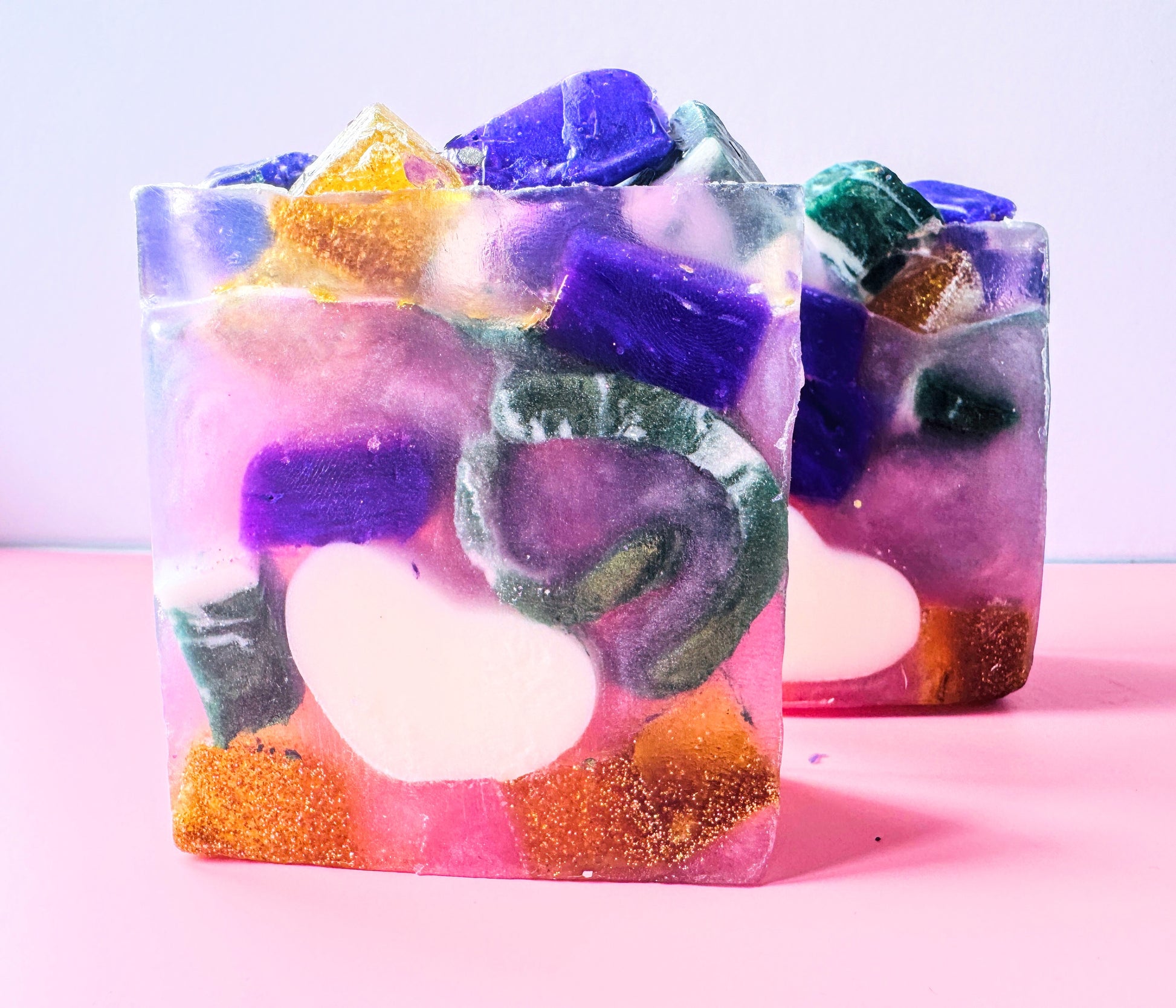 A bright, uplifting collection of handcrafted soap made with a plant-based glycerine base. Each bar is created like a little piece of art — layered with colourful embeds, hearts, swirls, and shimmering details that make every bar unique.