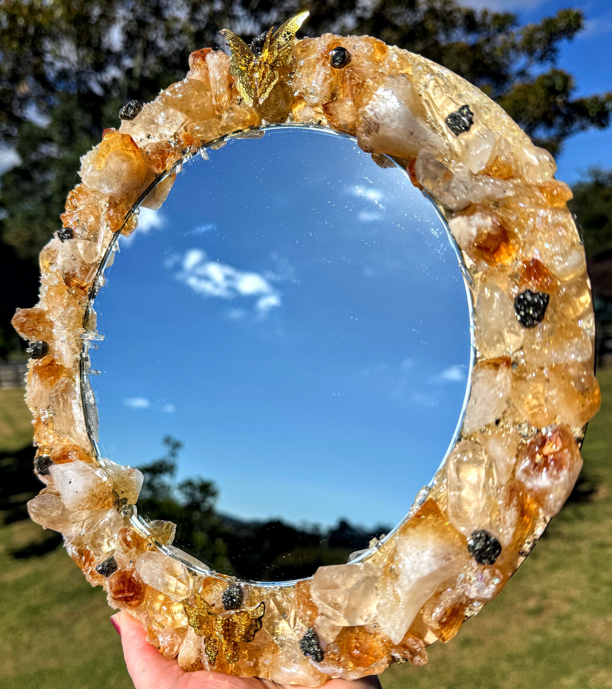 Handcrafted with Citrine, this mirror shines with warmth and uplifting energy. Each crystal is carefully set in resin, showcasing Citrine’s golden tones while ensuring durability and strength.