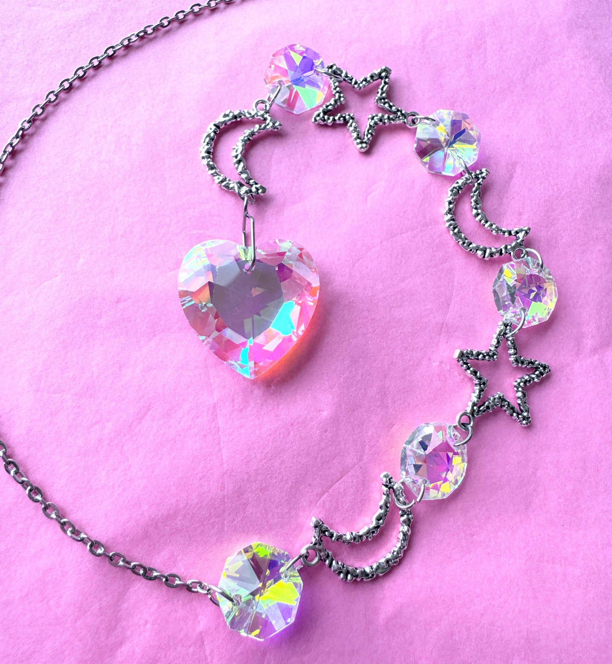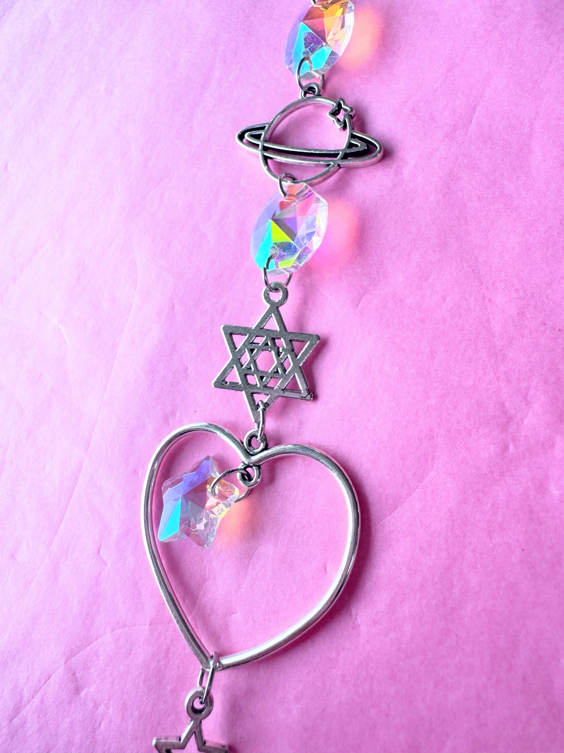 Bring a little celestial sparkle into your space with this gorgeous iridescent sun catcher. It features a heart-shaped crystal that catches the light beautifully, along with cute silver moon and star charms for that extra dreamy vibe.