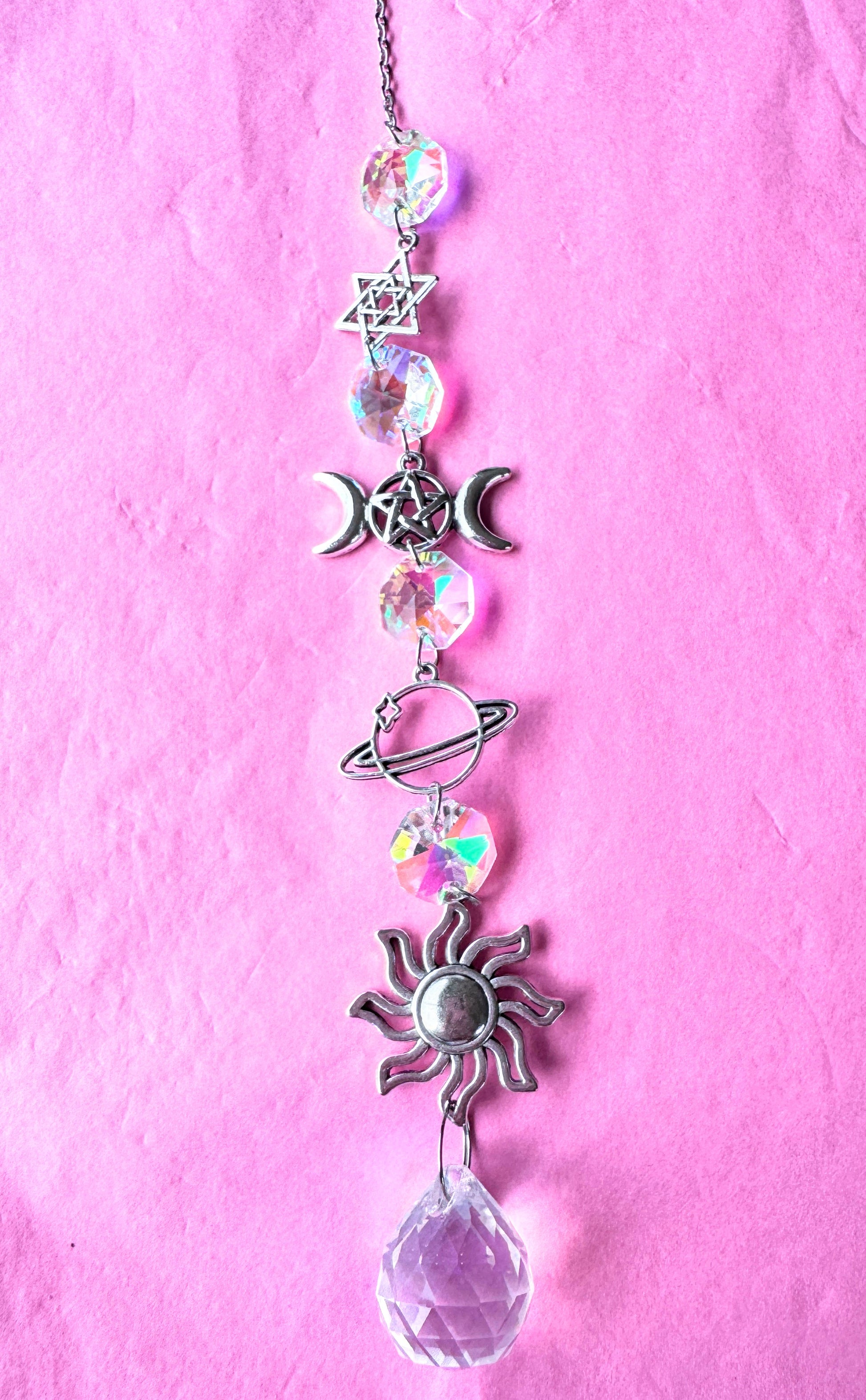 Iridescent Triple Goddess Suncatcher – Silver or Gold with Triple Moon, Pentacle & Sun Charm