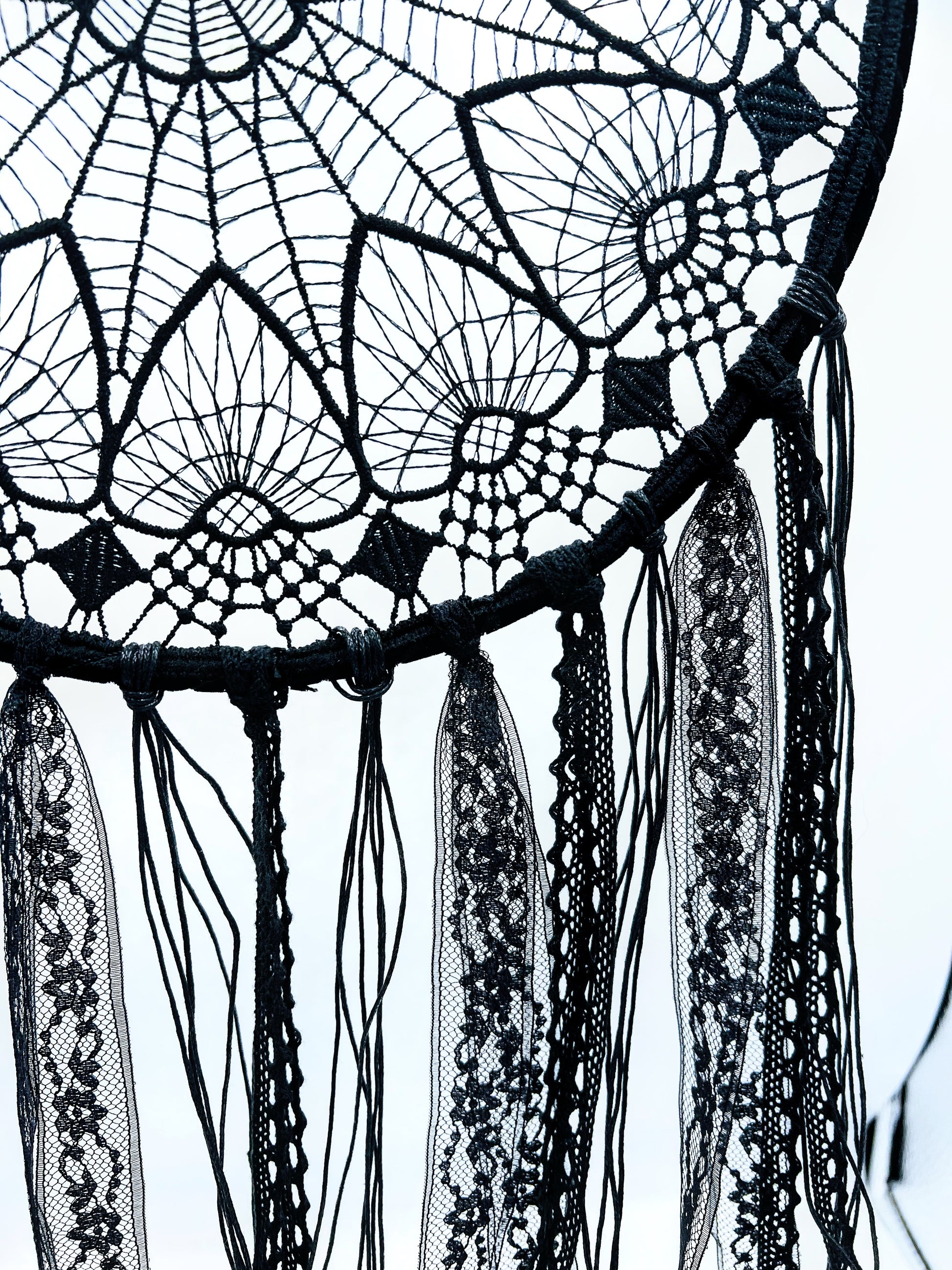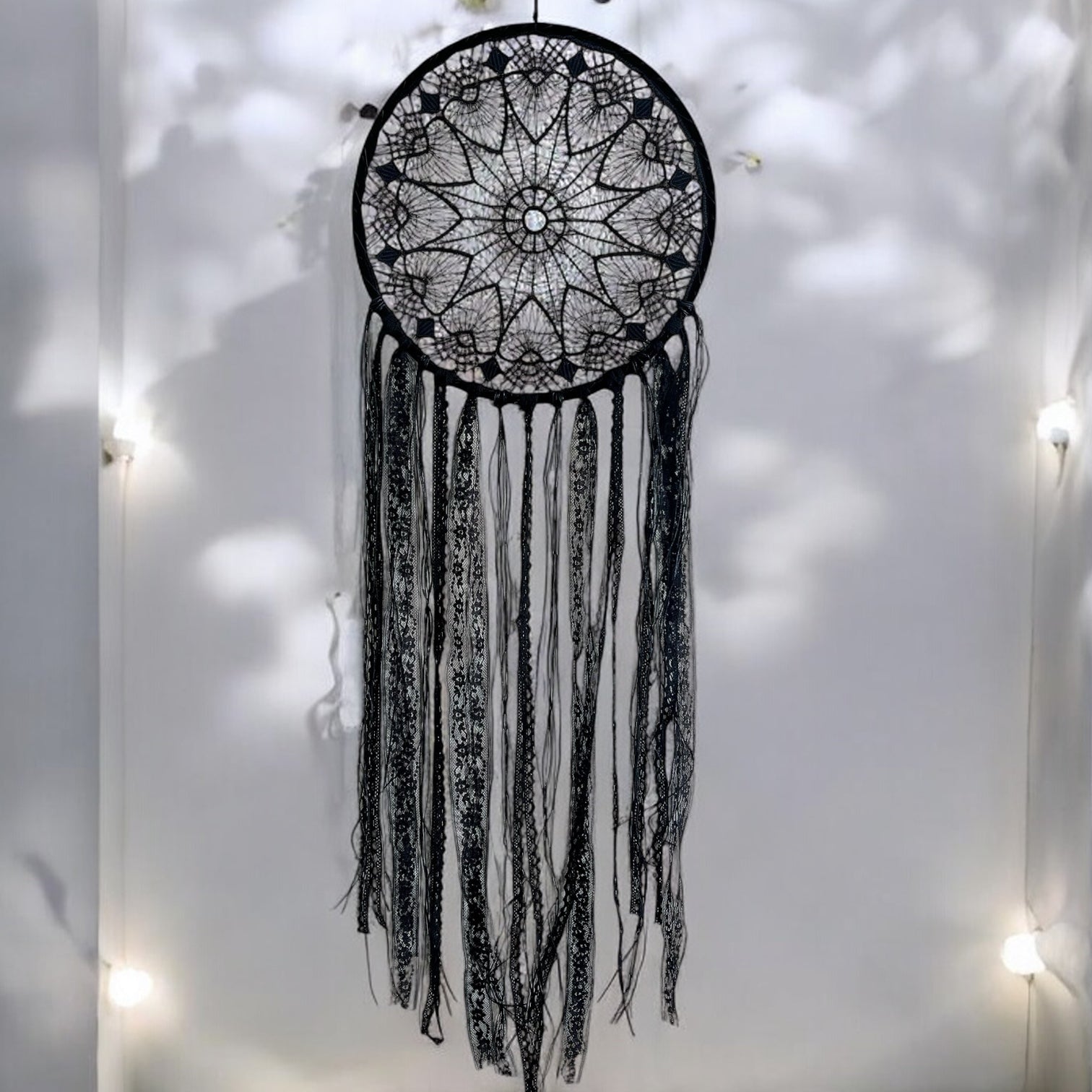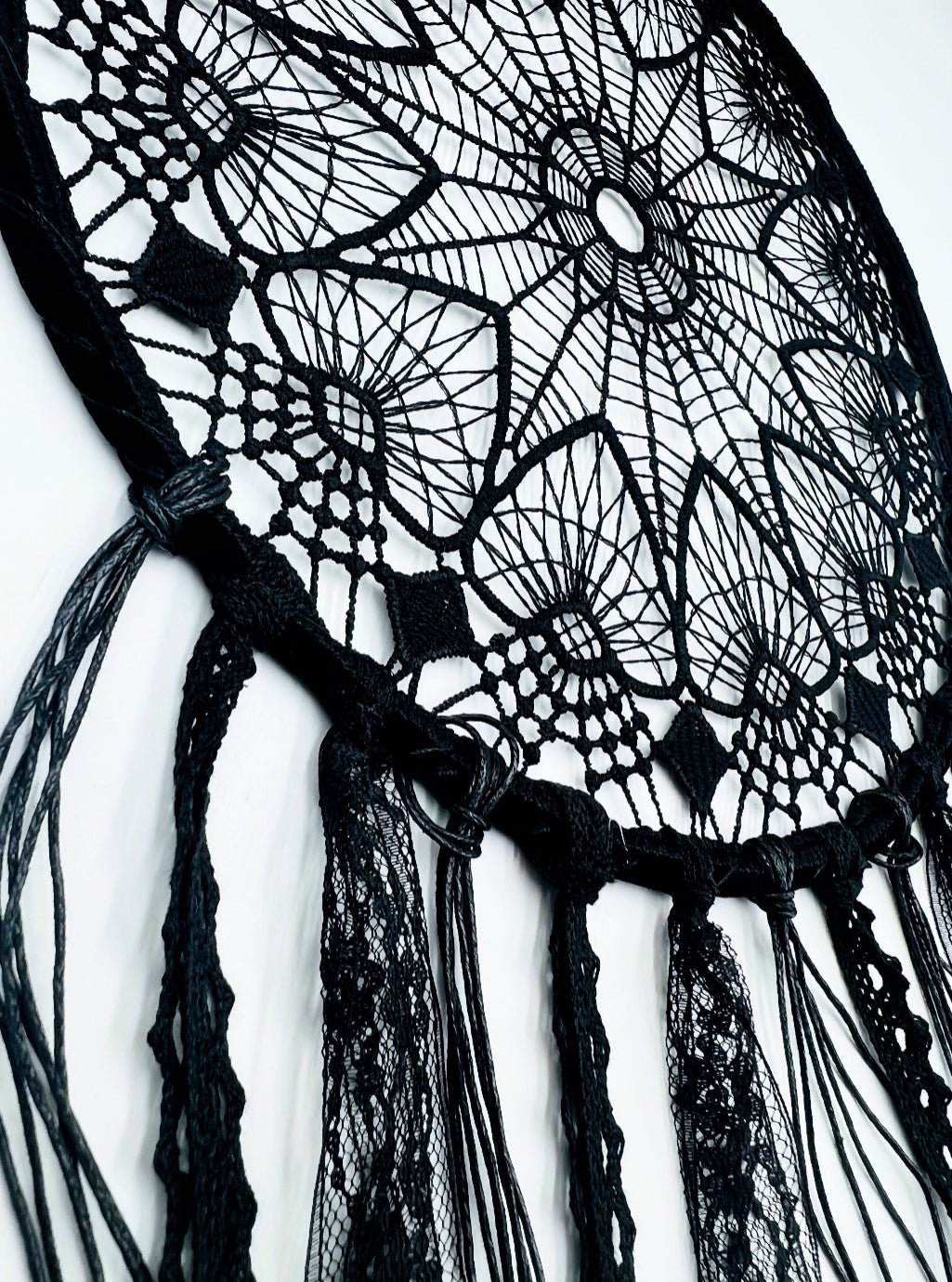 Add a little magic to your space with this handcrafted dreamcatcher. Made with a 26cm black lace hoop and trailing ribbons & lace that reach about 92cm long, it’s perfect for adding a dreamy, mystical vibe to any room.