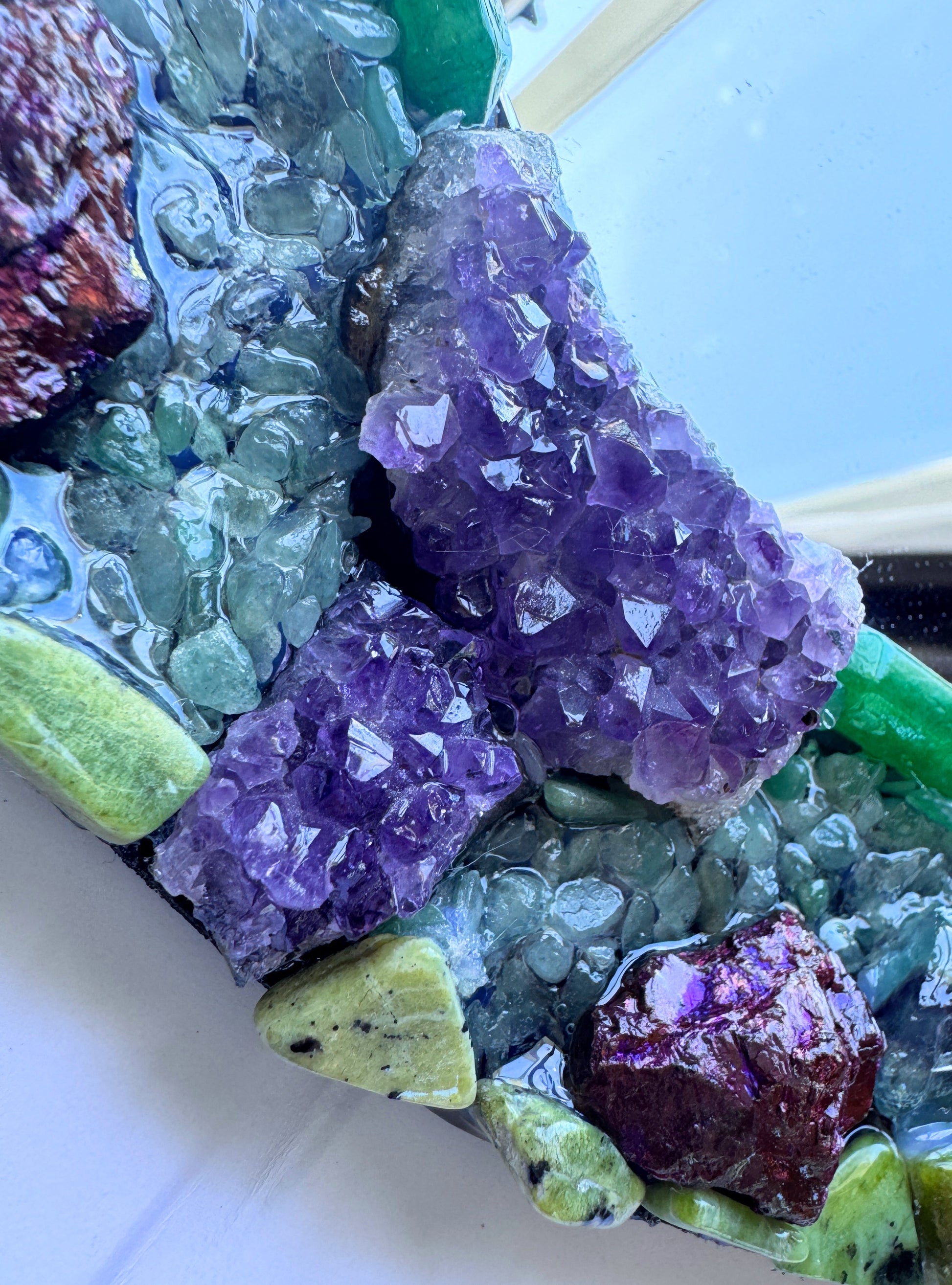 This piece suits anyone drawn to nature energy, fae themes, or rich green–purple tones. Every crystal is placed by hand, making this mirror a one-off creation with its own character and atmosphere.