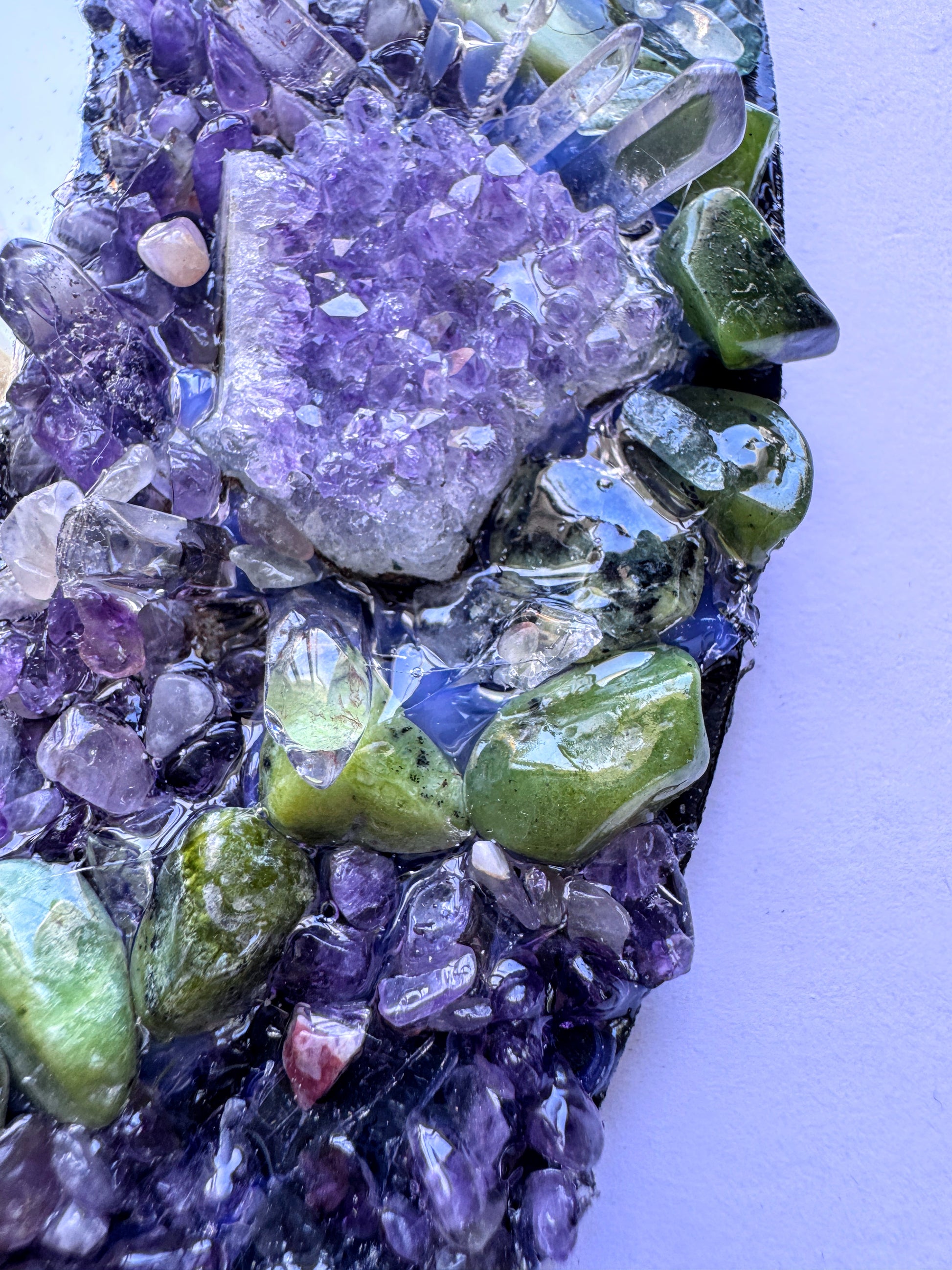 “Fae Forest” is built with a mix of greens and purples that creates a deep, woodland-mystic look. The frame holds chunky amethyst for clarity and intuition, green aventurine and jade for earthy stability, flashes of peacock pyrite for iridescent colour, and a green aura quartz geode as the main focal point.