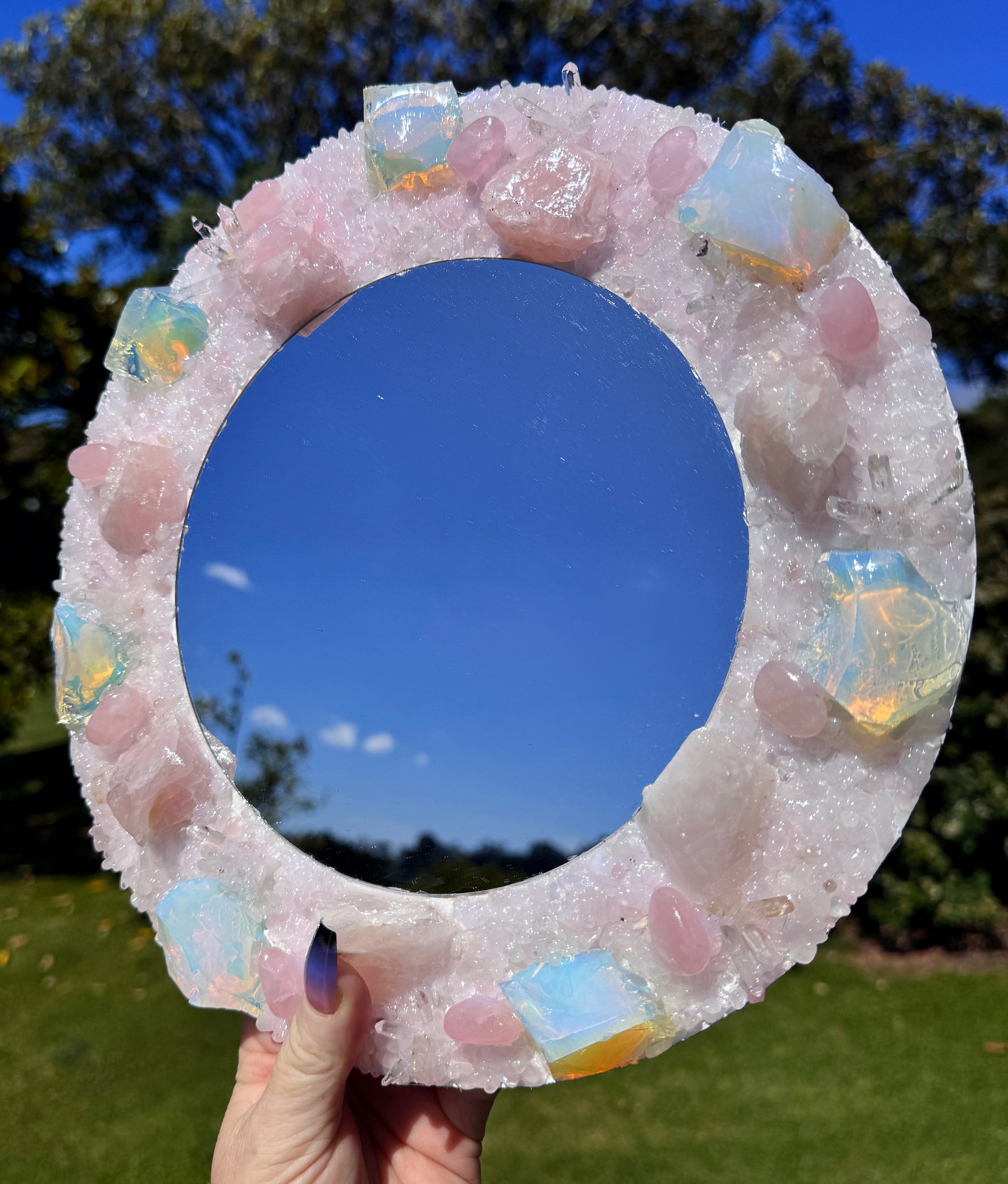 “Aphrodite’s Dream” is created to bring soft, heart-centered energy into a room without being overpowering. The frame is set with solid rose quartz pieces and glowing opalite, giving it a pale, luminous look that shifts subtly with the light.
