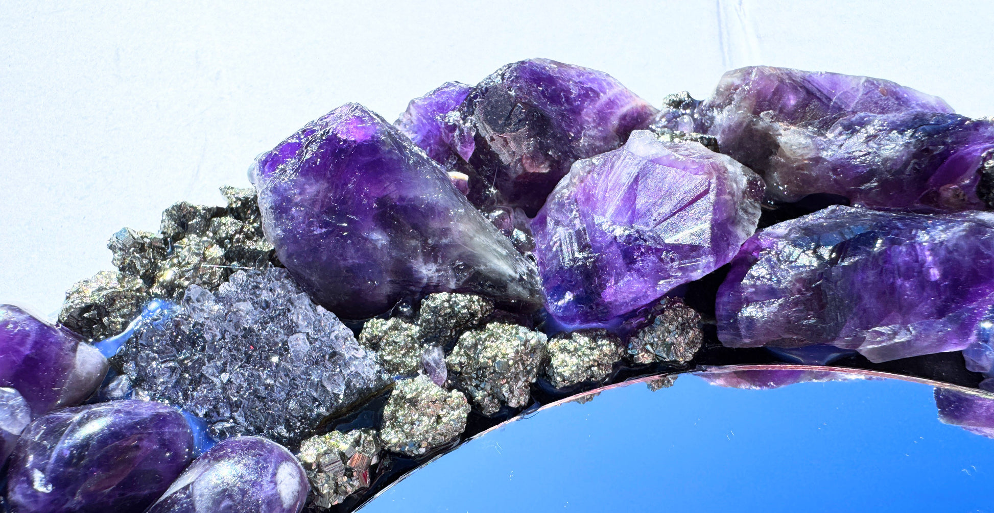 The combination creates a strong, defined presence with a clear amethyst focus. Each crystal is placed by hand, giving the mirror its own layout and character.