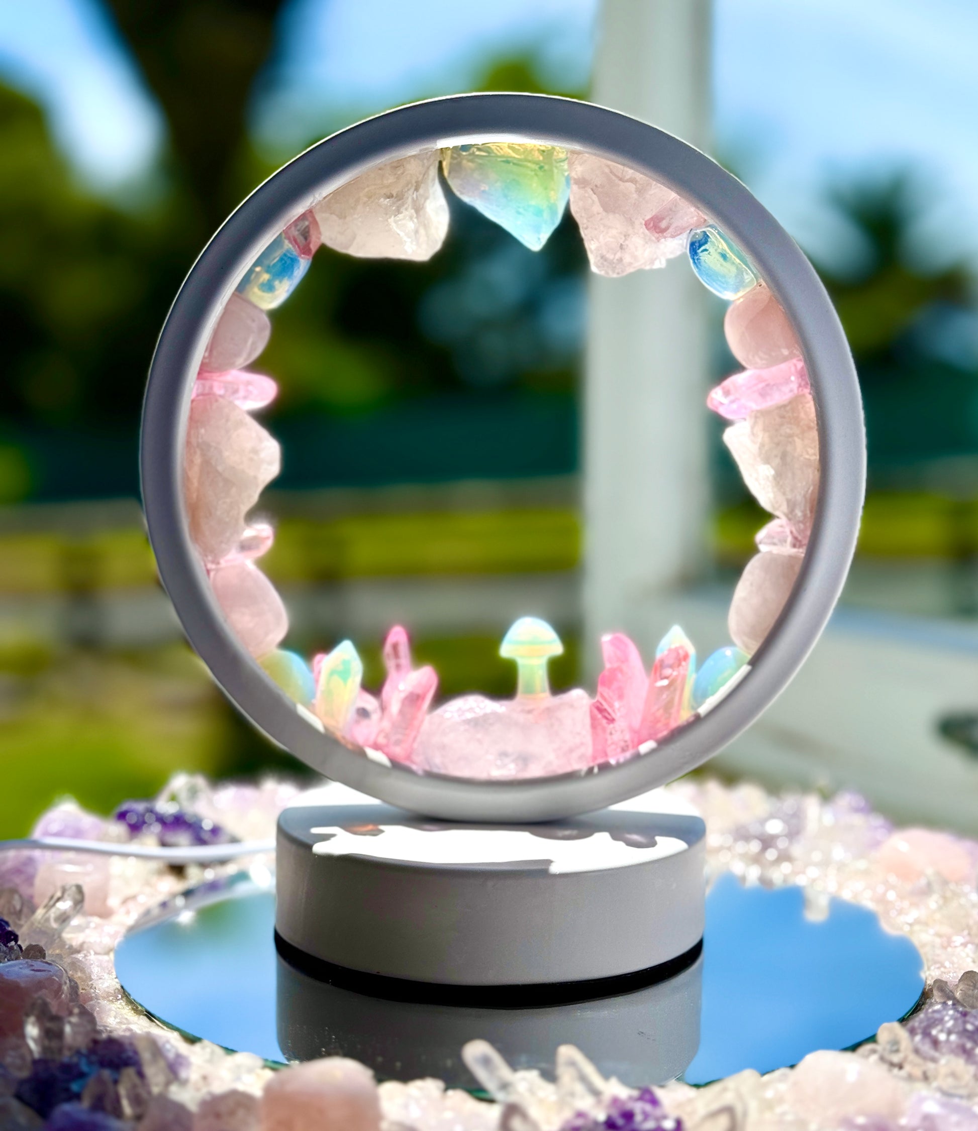 This 16 × 18 cm round lamp is designed with rose quartz, opalite, and pink aura quartz arranged around the frame and clustered at the base. When lit, the colours blend into a pastel glow of pinks, blues, and soft yellow tones that feels uplifting, gentle, and a little bit magical.