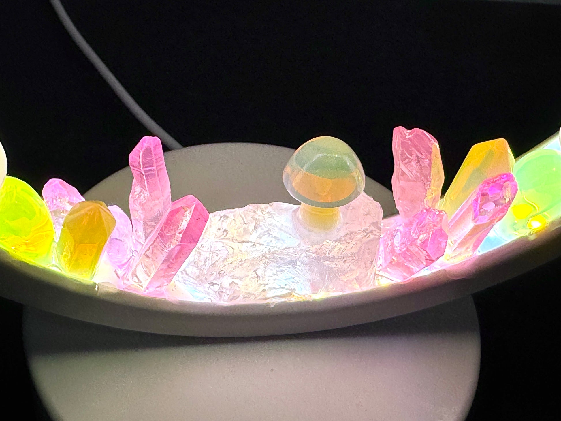 Every lamp is one-of-a-kind, handcrafted with natural crystals to create a unique little world inside the frame.