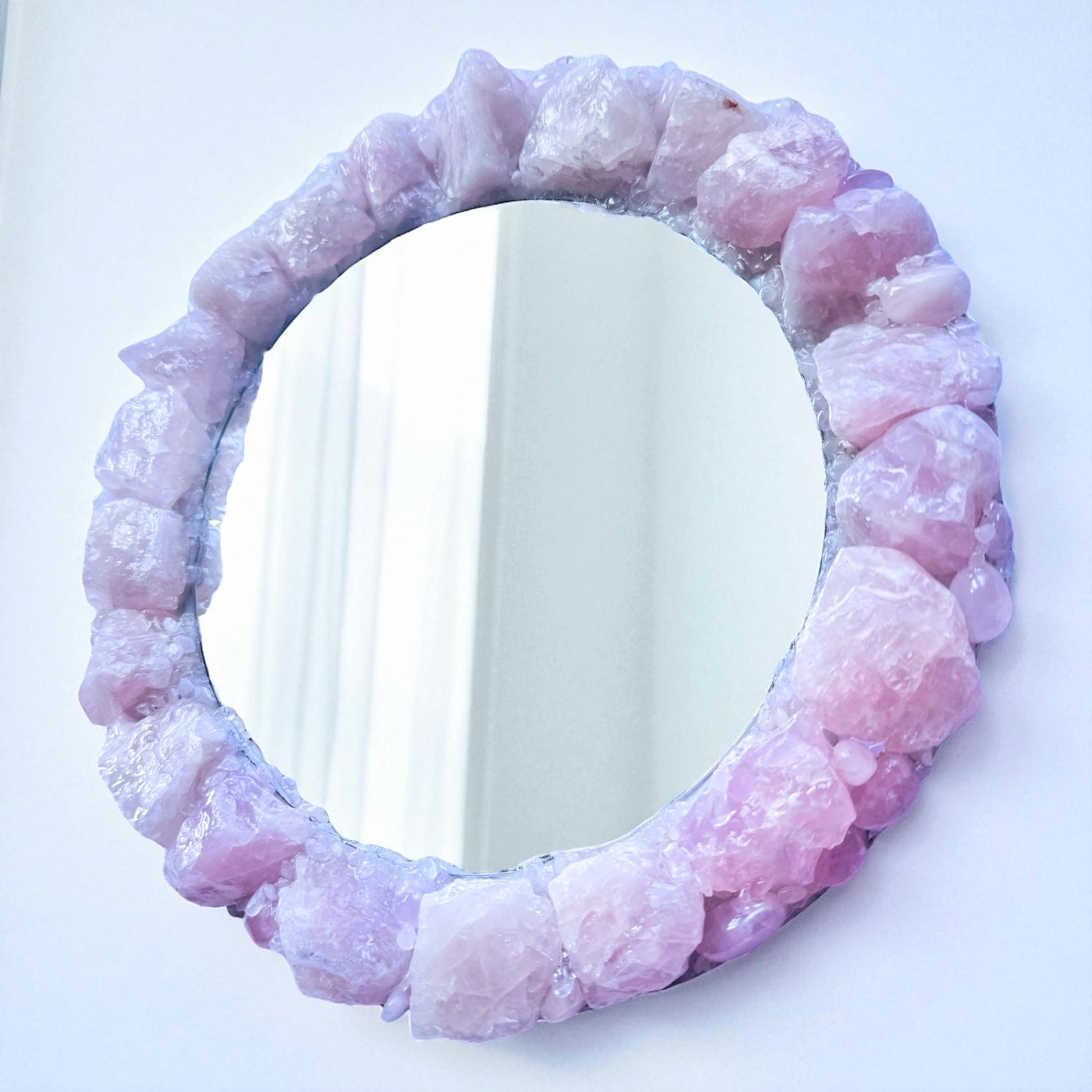 Handcrafted with genuine Rose Quartz, this mirror carries the gentle, loving energy of one of the most cherished healing stones. Each crystal is carefully set in resin, highlighting the soft pink tones while ensuring durability and strength.