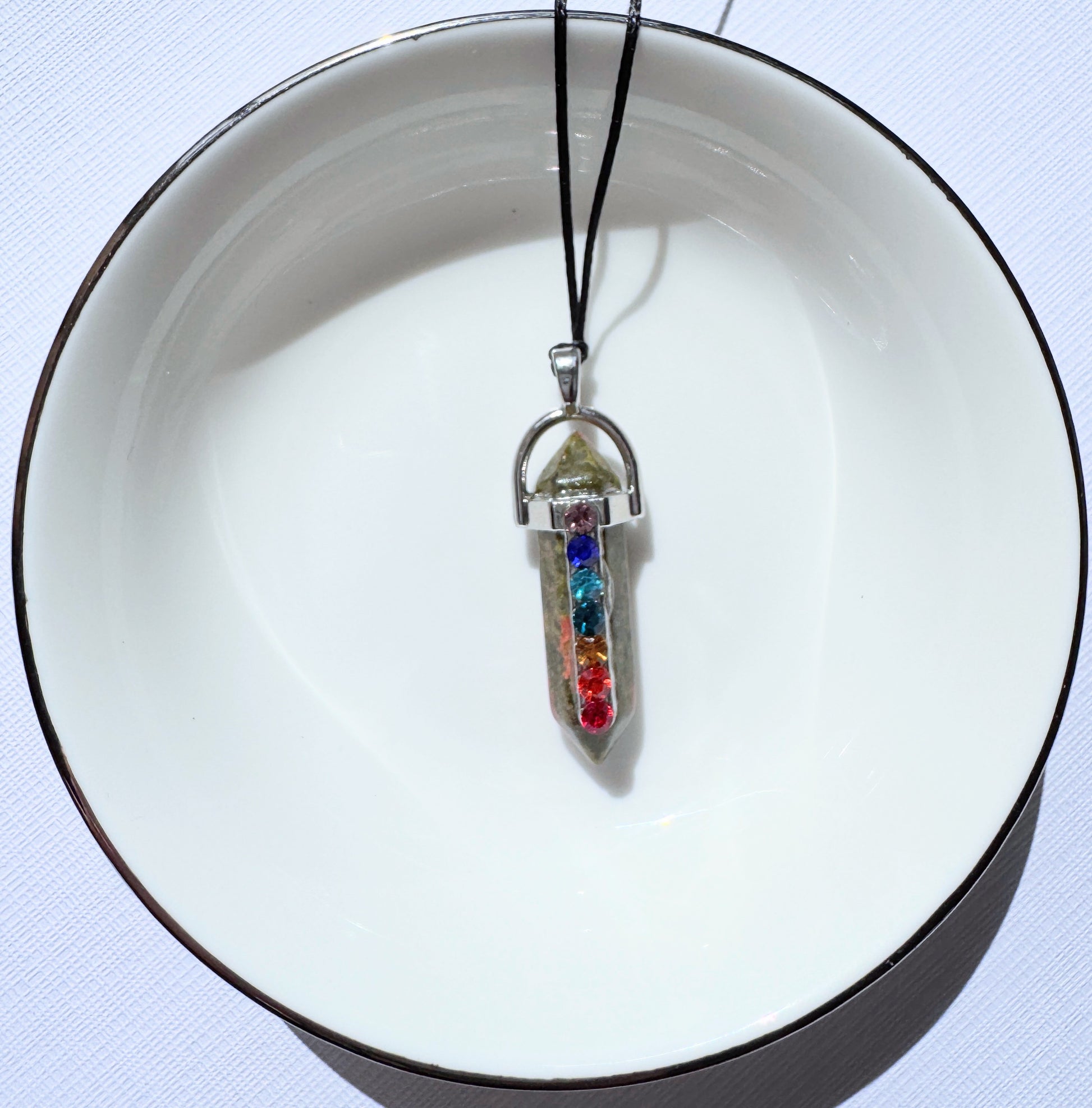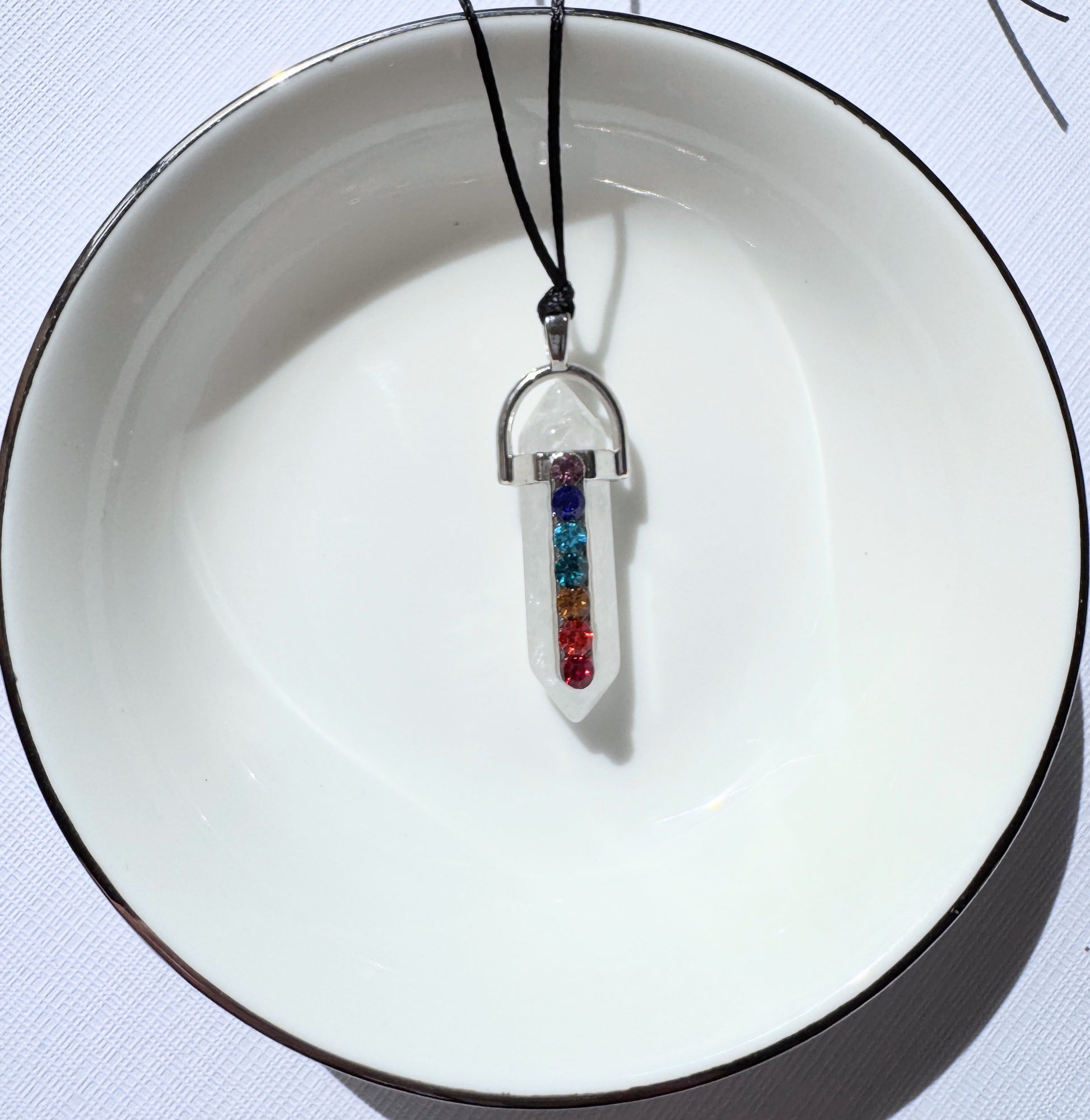 These 4cm crystal point pendants feature seven vibrant chakra colours, symbolising balance and harmony. A meaningful accessory for everyday wear or meditation practice.